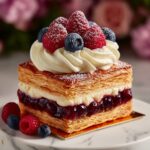 - Assemble the Cake: On one sheet of cooled puff pastry, spread an even layer of the whipped cream. Follow with a layer of the berry filling. Repeat the layering with the second sheet of pastry, whipped cream, and berries, finishing with a final cream layer on top.