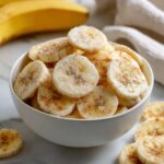 Next, mix together the granulated sugar and ground cinnamon in a small bowl. Toss the banana slices in your melted coconut oil or butter so they’re lightly coated, then sprinkle and gently mix the cinnamon-sugar mixture over the slices. This step ensures every chip gets that lovely cinnamon sweetness.