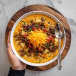 - Serve and garnish: Ladle the soup into bowls and top with extra shredded cheddar cheese, cooked bacon crumbles, sour cream, and green onions if desired. Serve immediately while hot and comforting.