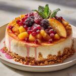 - Serve: Spoon the cooled fruit topping evenly over the chilled cheesecake. Garnish with extra fresh berries, peach slices, and mint leaves if desired. Slice carefully for clean cuts and serve cool.